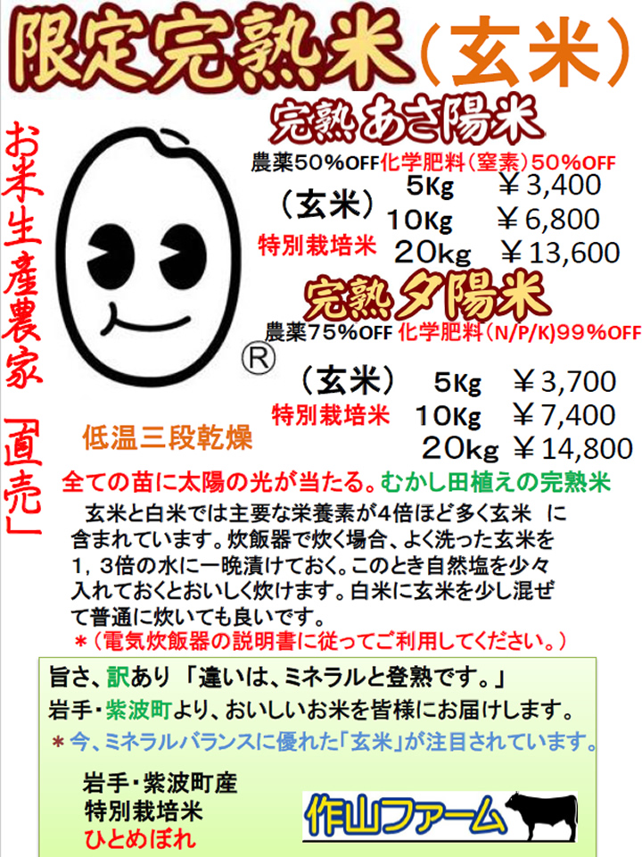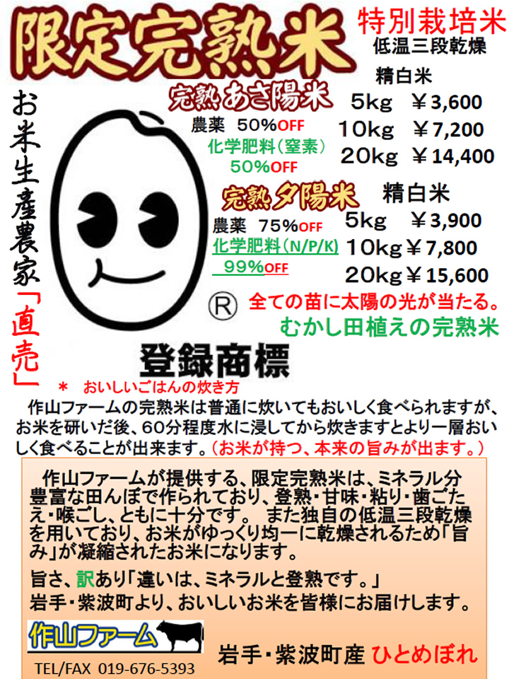 作山ファームの「限定完熟米」のご注文は、ご注文フォーム、ファックス、お電話で承っております。